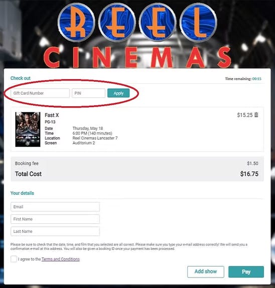 Gift cards can be used to buy tickets online, or at the theater. You can also use them to buy items at the concession stand or the bar. To use the gift card online, you can click the "Buy Tickets" button at the top of this page, and order tickets like normal. At the last page, before you click the "Pay" button, you must enter the gift card number and PIN at the top of the page. See the pictures below for details